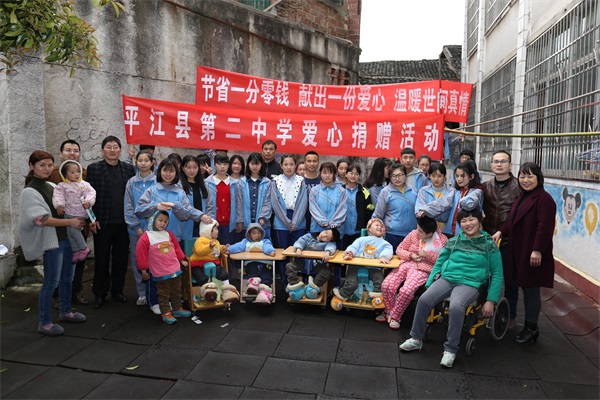 此前,平江二中足迹社和公益社的学生调查走访了平江县儿童福利院,了解到他们紧缺一批纸尿裤、洗发水、沐浴露等最基本的生活必需品。于是政教处、团委、社团联合部向全校师生发出“用爱心驱散阴霾,用行动撒播希望”的爱心募捐倡议。倡议发出后,校长何进率先行动,各班学生积极响应,最终筹得善款29487.8元,购置了卫生纸、纸尿裤、纸尿片、洗发水和沐浴露等爱心物资。