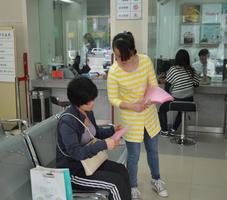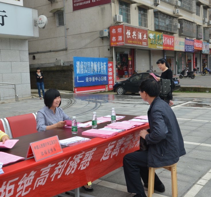 “那边我们还可以去一下,办业务的人还是比较多的。”小熊指着不远处的中国银行营业点,几个年轻人又向目标出发。门口的保安一开始不太明白他们是干嘛的,但看到“打击和处置非法集资”字样的画册后,就马上知道是金融办的,可见银行工作也做得很到位了。