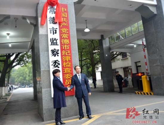 2018年1月1日上午,常德市委门口,市委书记、市人大常委会主任周德睿,市委常委、市纪委书记、市监察委员会主任罗翠林在众人的掌声中,合力迅速拉开红绸,“常德市监察委员会”白底黑字的崭新牌匾映入众人眼帘。旁边红底黄字的“中国共产党常德市纪律检查委员会”与其相映成辉。