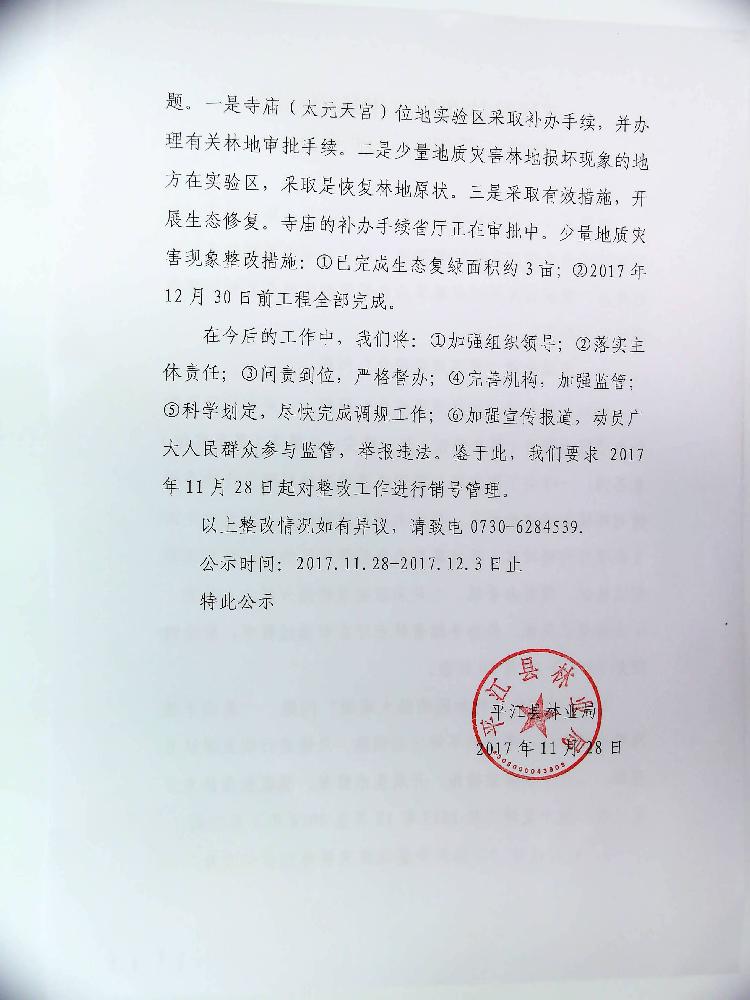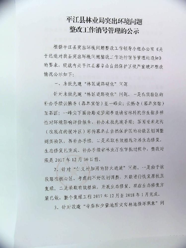 平江县林业局突出环境整改工作销号管理的公示