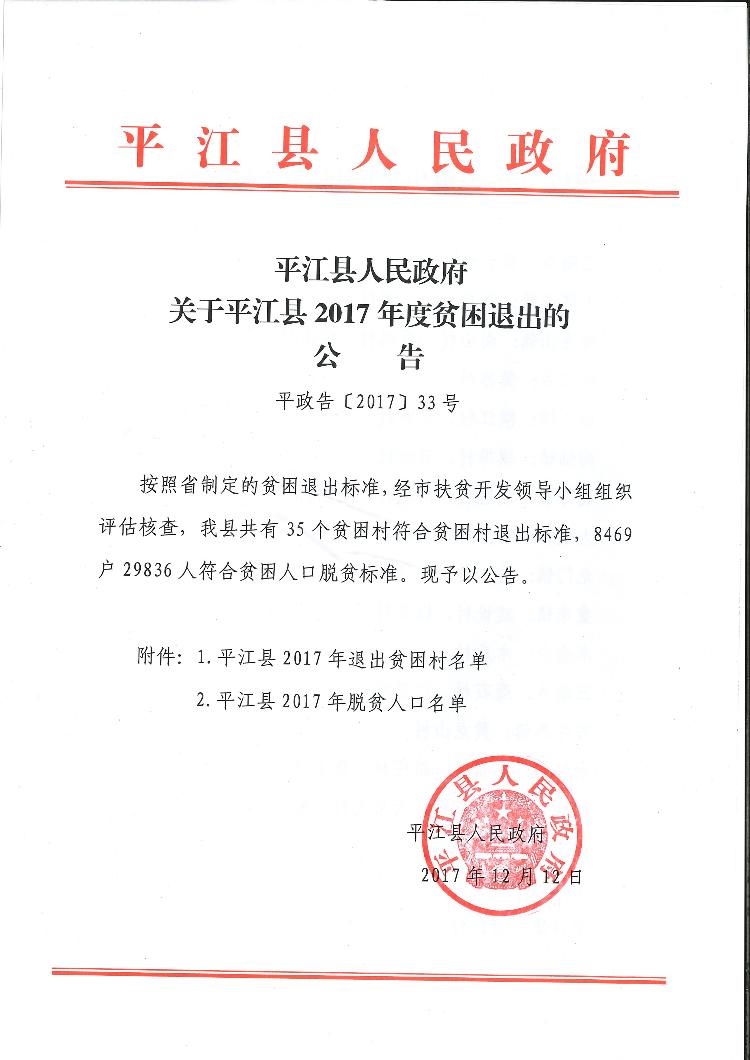 平政告〔2017〕33号 平江县人民政府关于平江县2017年度脱贫困退出的公告