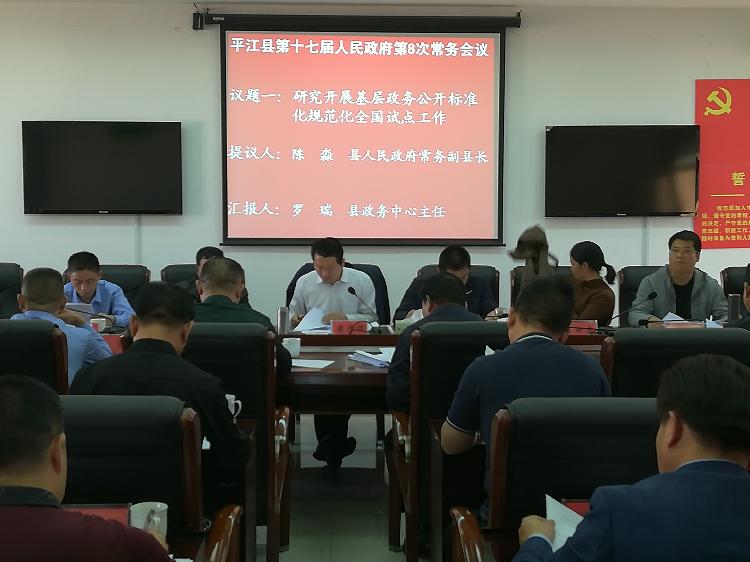 11月9日下午,县委副书记、县长黄伟雄在县政府六楼会议室主持召开平江县第十七届人民政府第8次常务会议,研究开展基层政务公开标准化规范化全国试点等工作。